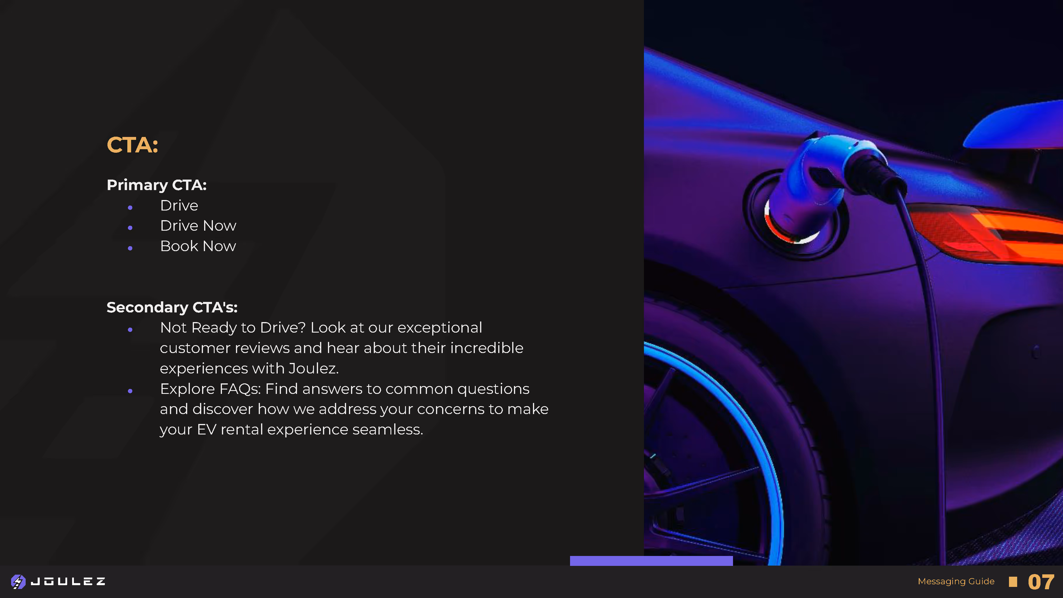 Joulez, a premium EV rental network known for its luxury electric fleet and seamless, mobile-first platform, sought a sophisticated brand identity and customer experience to revolutionize the traditional market and appeal to discerning, eco-conscious travelers.